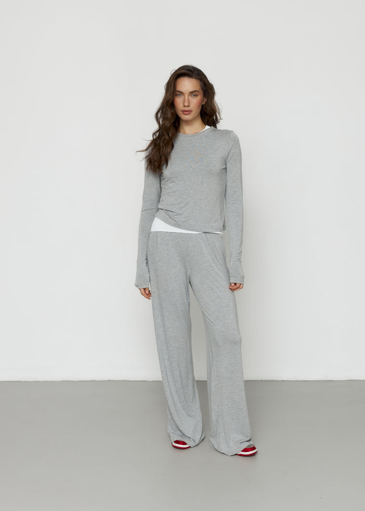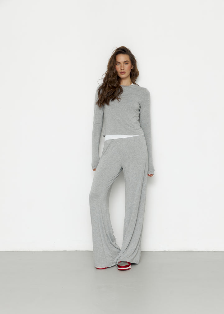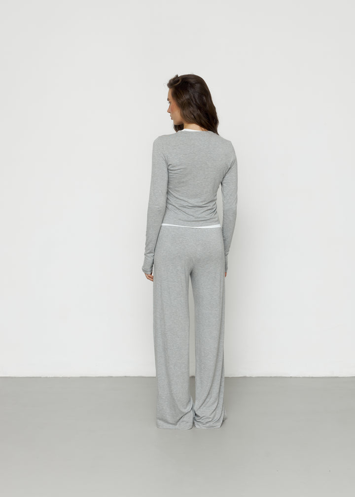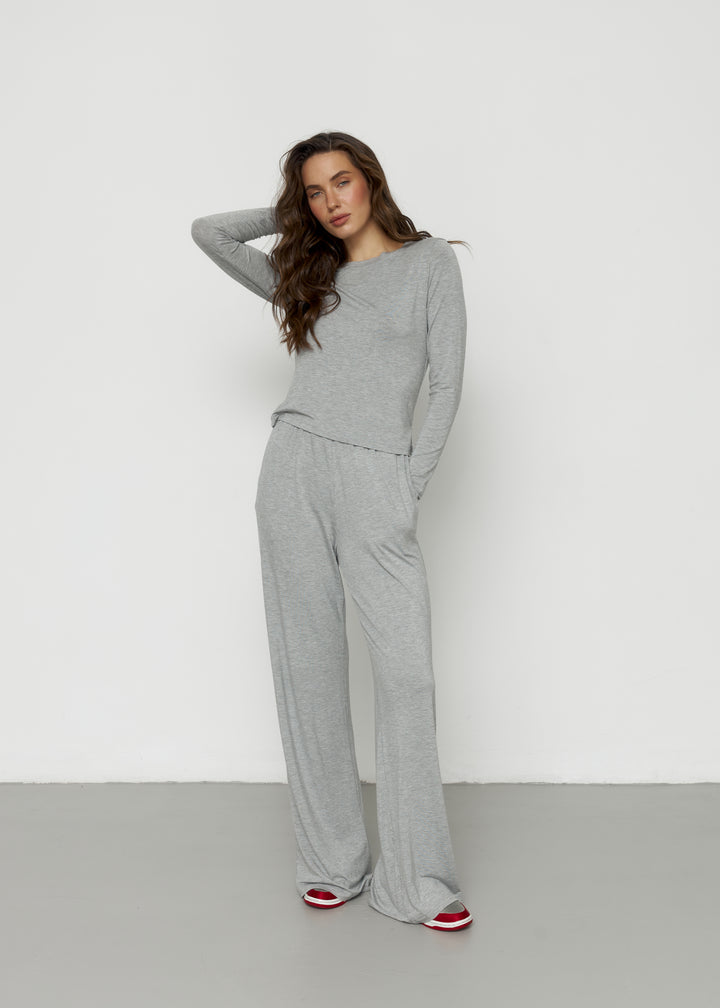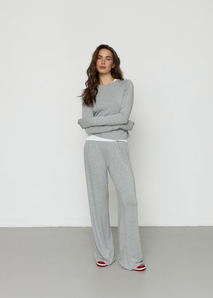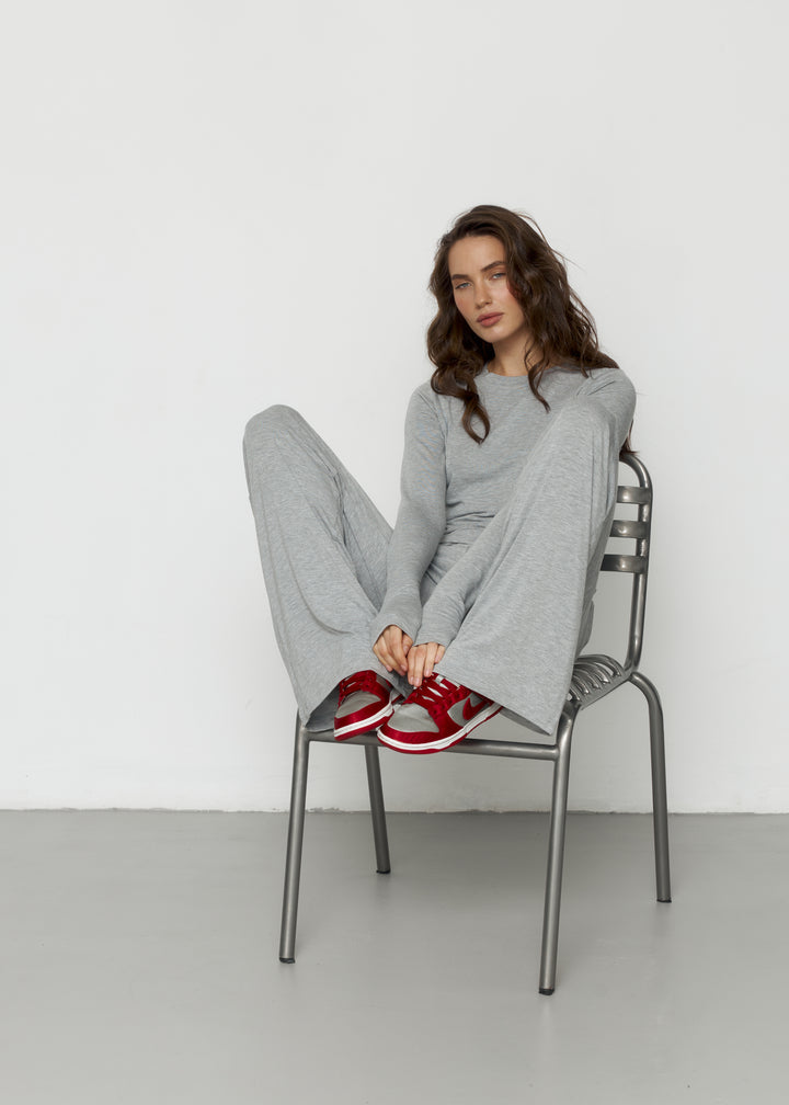 Штани максі-довжини з еластичним поясом та лонгслів із подовженими рукавами — м’який, комфортний сет на щодень.